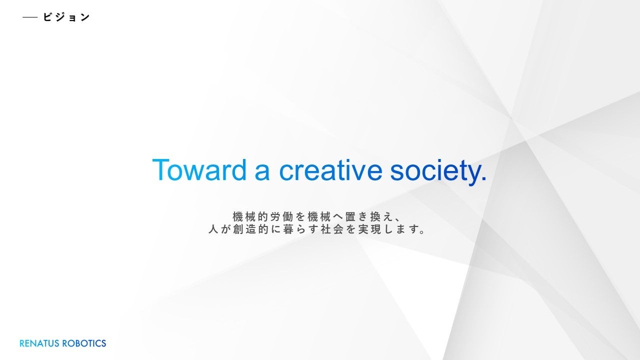 RENATUS ROBOTICSは、「Toward a Creative Society.」をビジョンに掲げ「機械的労働を機械へ置き換え、人が創造的に暮らす社会」の実現にコミットする。