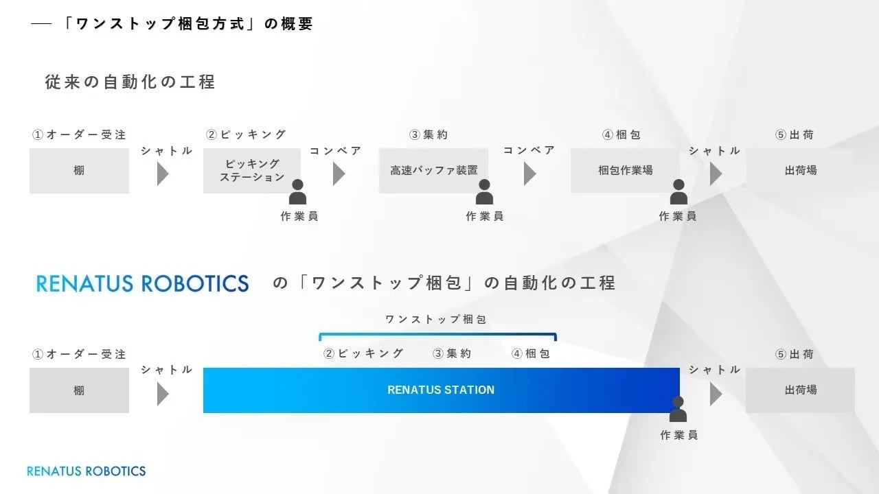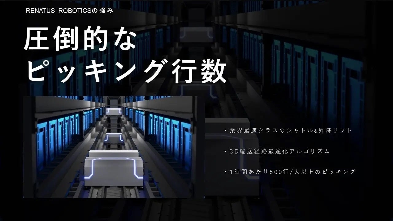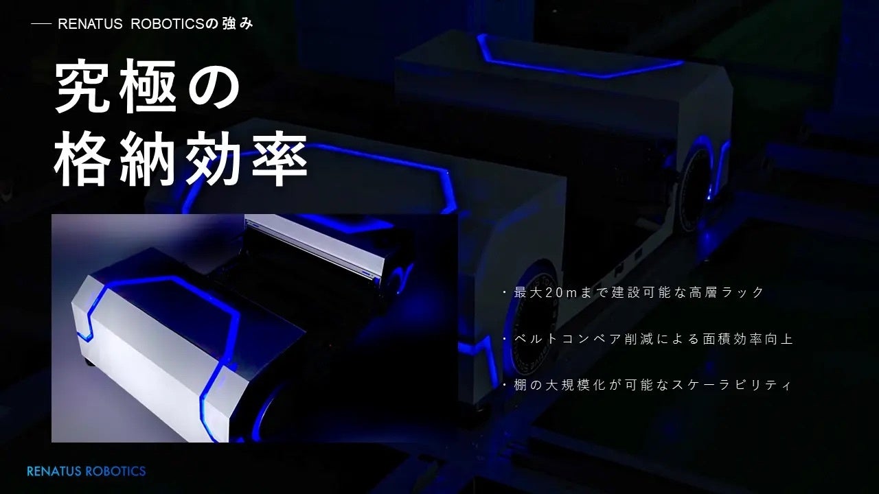 RENATUS ROBOTICSは世界初の「ワンストップ梱包」型の自動倉庫システム「RENATUS」を提供している。